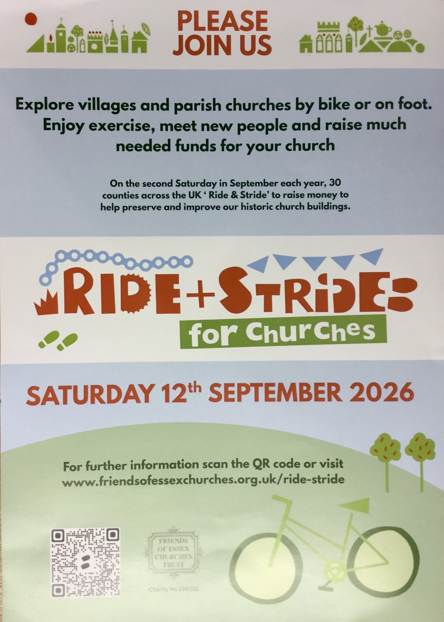 Help us make FECT's 75th anniversary year the best yet! Start preparing now - recruit new participants, plan churches to visit and encourage fellow congregants to host a special event on Ride & Stride day. Welcome visitors and invite them to admire the atmosphere and beauty of your church; perhaps enjoy a coffeee morning or cake sale, or hold a nearly new book sale or bell ringing practice. Many participants have told us of the wonders they discovered only short distances from their homes and of their delight in being warmly welcomed at open churches. Spread the joy, whilst raising much needed funds!